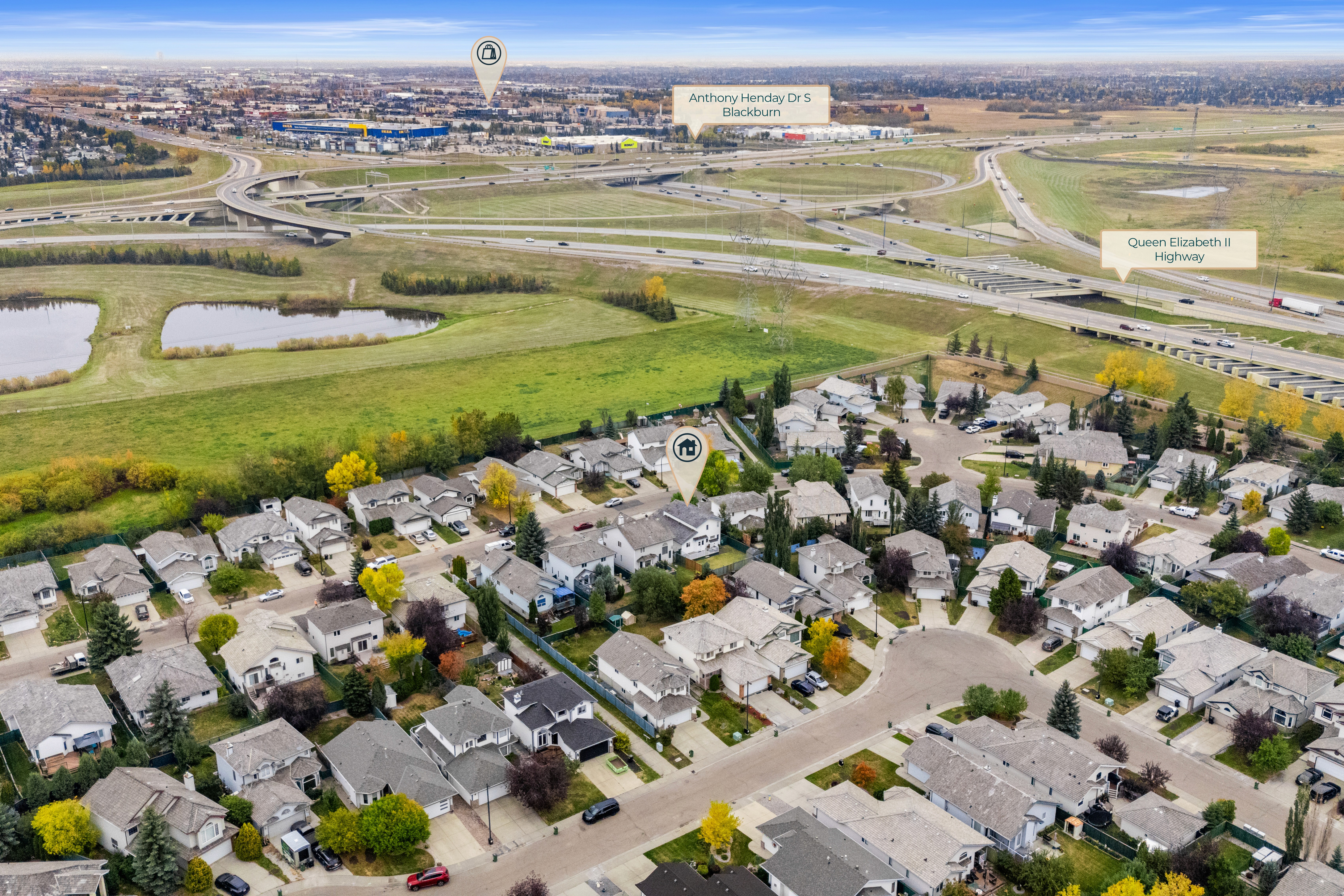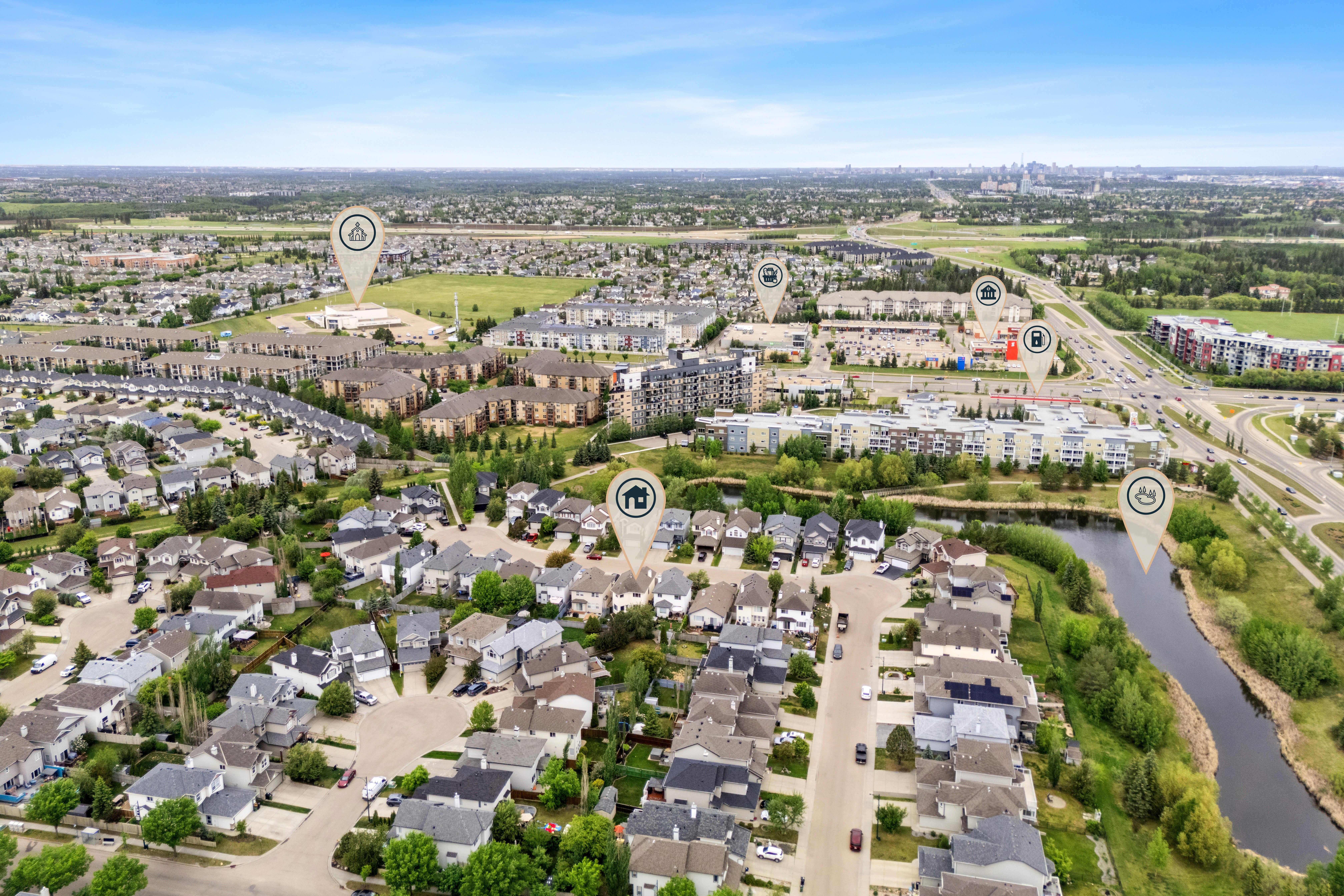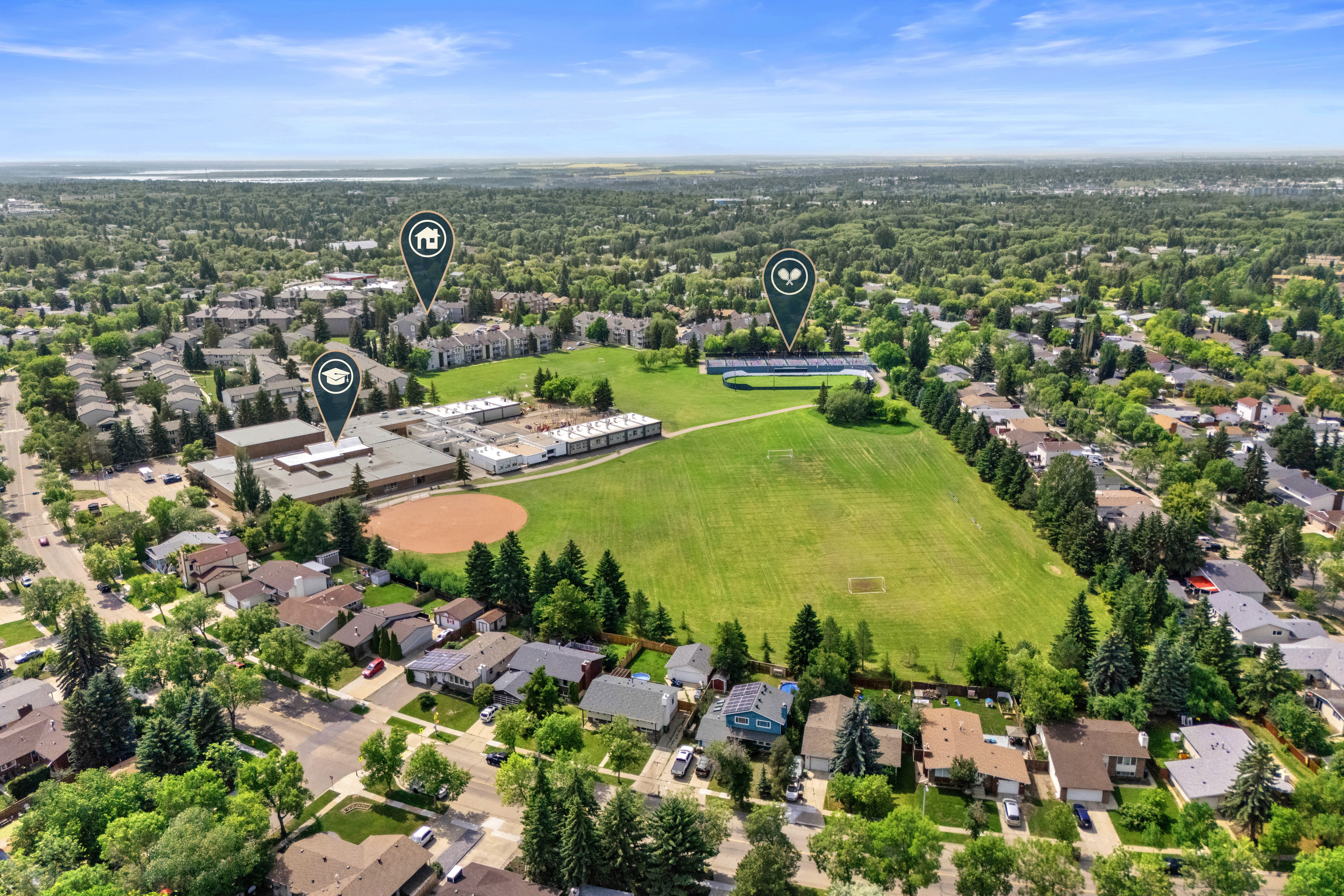 Aerial imagery highlights lot size, surrounding landscape, and nearby amenities, giving buyers a clearer understanding of Edmonton homes and their setting.